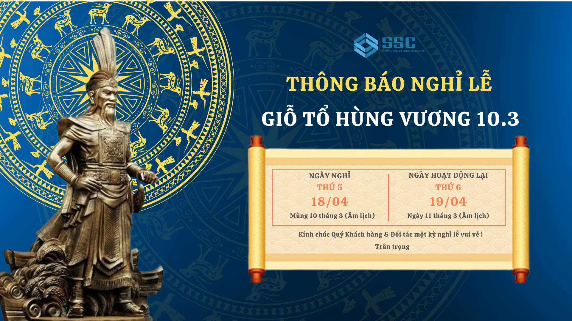 Công ty Cổ phần Giải pháp phần mềm SSC xin thông báo đến toàn thể Quý Khách hàng & Đối tác về lịch nghỉ lễ Giỗ Tổ Hùng Vương (10/3 âm lịch) như sau: